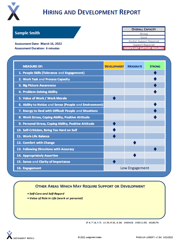 Tools like the Hiring and Development Report move beyond surface-level capability and provide visibility into how a person is likely to perform in real conditions.